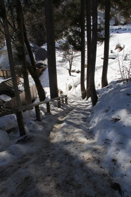 本来なら石段があるようなのですが、雪の斜面になっていました。