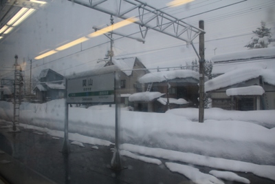 関山駅停車。駅前の民家ではおじさんが雪下ろしをしていました。