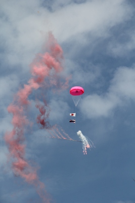 多くのロケットにはパラシュートが内蔵されているようで、風に乗って降りてきます。