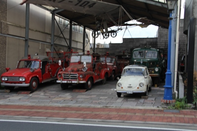 一つ目のガレージ。消防車やボンネットトラック。