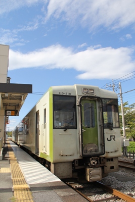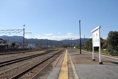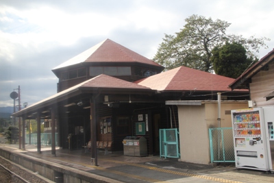 寄居に到着。ワンマン運転をしているので後方確認用のミラーが立っています。