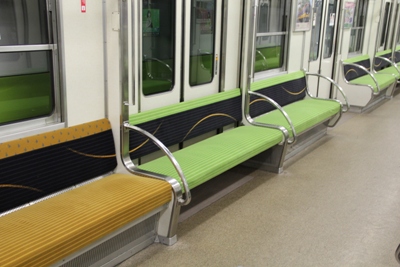 京阪独自なのがこの格納式座席。ラッシュ時はドアの上にひきあげて収納します。