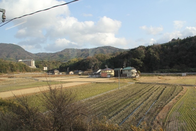 岩国の街を背に西へ。真ん中にみえる筒状の建物は飛行場の管制塔でしょう。