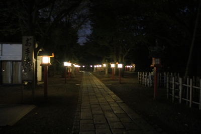 もう遅いので人はいません。柔らかな明かりに照らされた参道が幻想的でした。